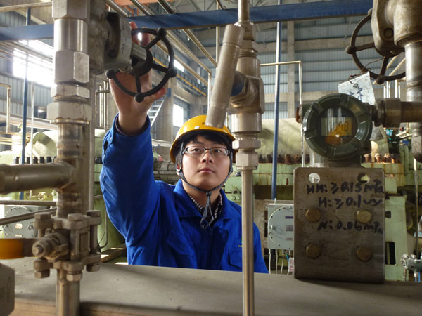 圖為合成工段操作人員正按工藝要求調(diào)節(jié)閥門。