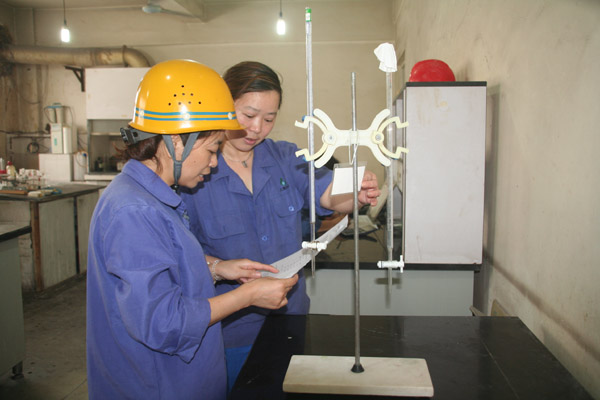 圖為該公司檢驗中心員工將經(jīng)過銅陵市計量測試研究所檢定的酸式滴定管送到磷酸車間化驗分析班,并了解該化驗分析室實驗條件和需求。(陳沐)