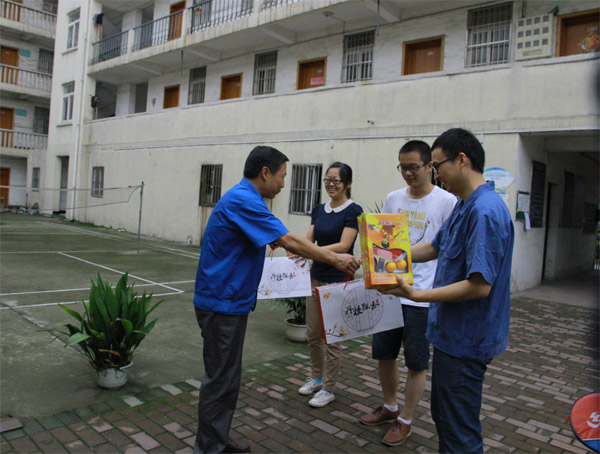z6mg人生就是博公司黨委副書記、工會主席吳健為外地單身青工贈送月餅和體育用品(陳沐 攝)