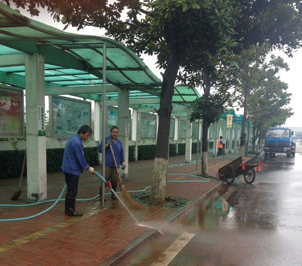 圖二:梅雨季節,該公司員工上下班車候車亭地磚滋生青苔。為防止人員行走時滑跌,該公司政工部文明綜治委組織人員清除地磚青苔,并計劃于近期對地磚進行改造,以徹底消除這一安全隱患。