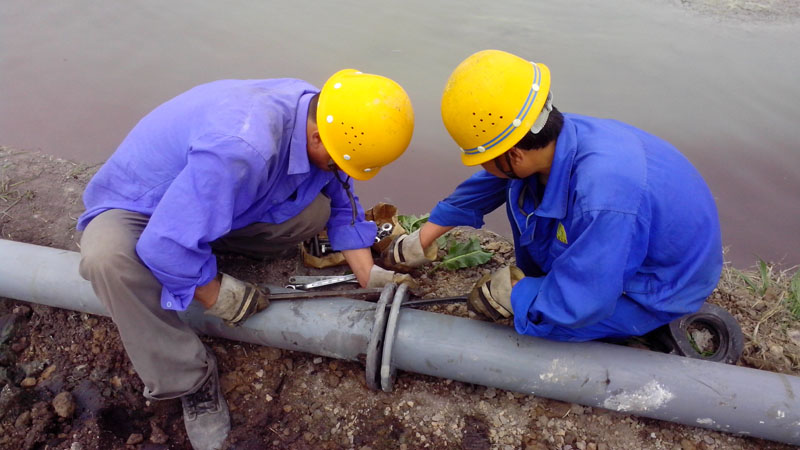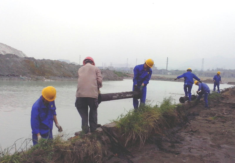 PO管銜接并不像想象的那么容易,有些管子陷入淤泥當中,人根本就不能靠近,他們找來鐵鍬,抬起一頭;另一頭陷得比較深,只能找來木頭墊子,人踩在上面將其抬起。畢竟是在淤泥上站著,用不上力,他們費了好大勁才將其拉起。就這樣,120m長的管道安裝完成已經是中午12點30分了。下午又運來20根PO管,他們繼續忙碌著一直到很晚。
